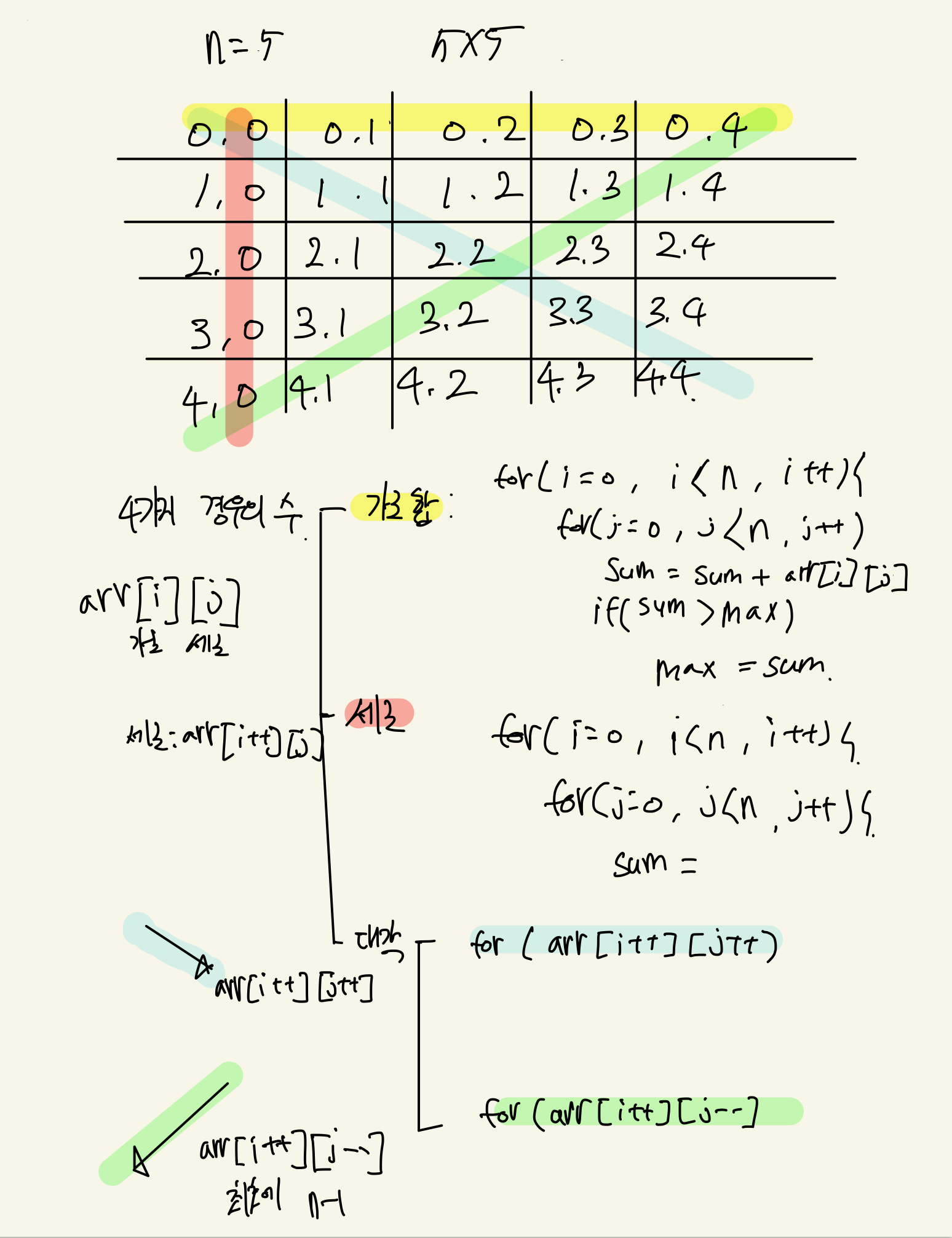 // 1. 좌측 상단에서 우측하단으로 내려가는 대각 arr[i++][j++]