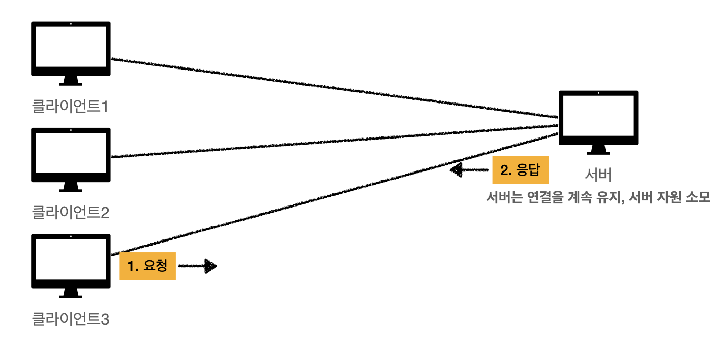 위 이미지처럼 연결을 유지하는 모델은 각 클라이언트별로 모든 논리적 연결로를 확립해둔다.