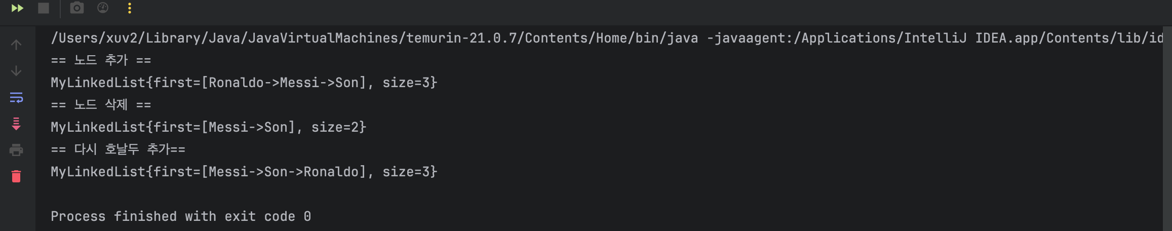 참고로 LinkedList는 배열리스트처럼 인덱스만 딱 찍어 탐색할 수 없기 때문에 이전 노드의 next 필드의 값을 통해 접근 하는 방식을 사용해야한다. -> 이 사실만 알면 구현은 어렵지 않다.