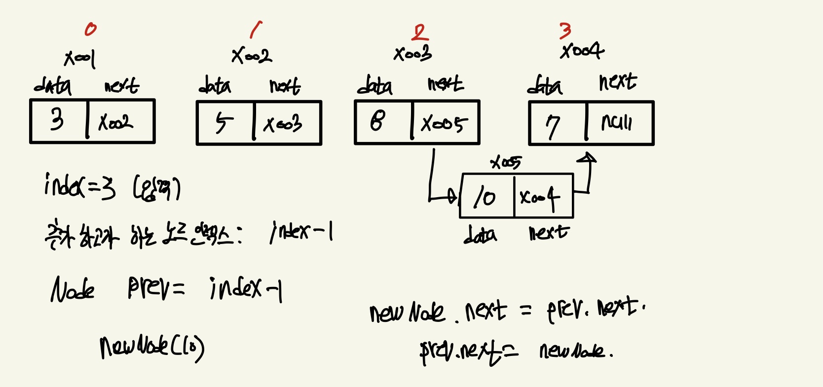 newNode.next = prev.next; // 기존이 가르키고 있던 다음 노드를 이제 얘가 가르켜야함