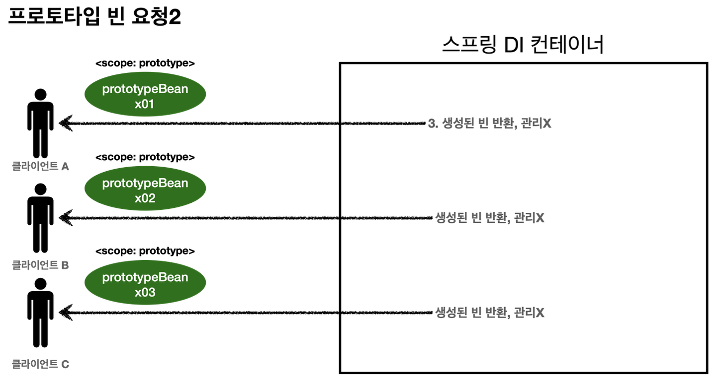 여기서 중요한 점이 반환 받은 프로토 타입 빈은 이제 제어권이 클라이언트에게 넘어갔기 때문에, 해당 객체를 정리하는 시점을 스프링이 알지 못한다. 그렇게 때문에 자원을 정리하는 @PreDestory 같은 메서드가 호출 될 수 없다. (하지만 객체를 생성하고 의존 관계를 주입하는 초기화 시점은 알기 때문에 @PostConstruct 는 실행이 가능하다).