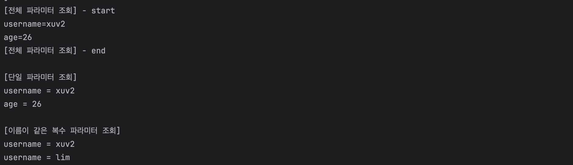 http://localhost:8080/request-param?username=xuv2&age=26&username=lim 에 대한 URL 요청 결과는 다음과 같다