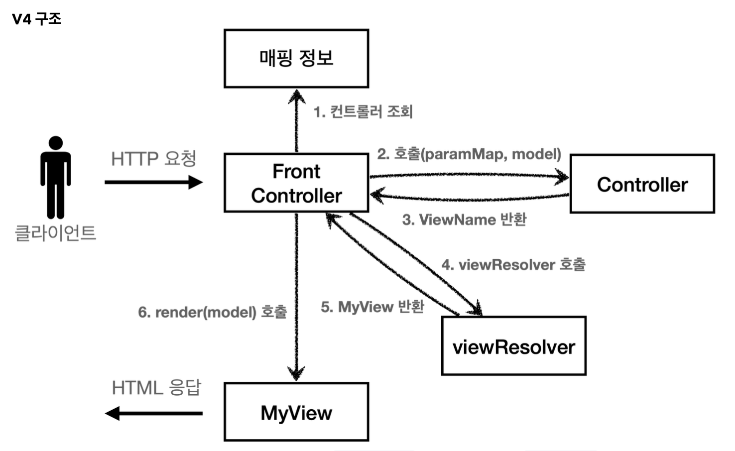 기본적인 구조는 V3와 같지만, 컨트롤러가 ModelView를 반환하는 대신에 뷰 이름만 반환하도록 해보자.