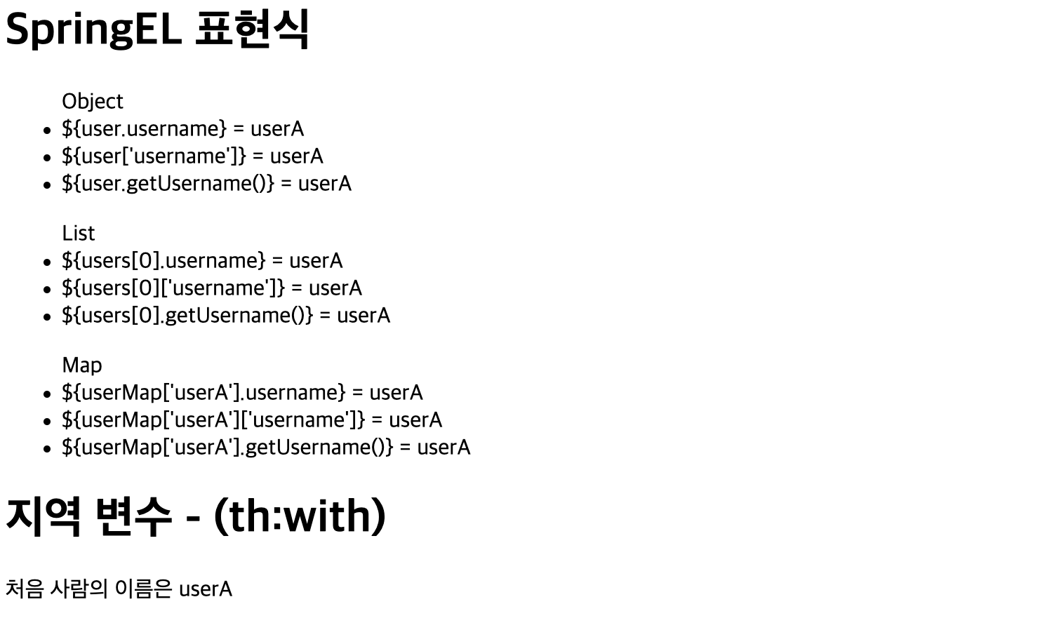 <li>${nullData}?: '데이터가 없습니다' = <span th:text="${nullData}?: '데이터가 없습니다'"></span> </li>