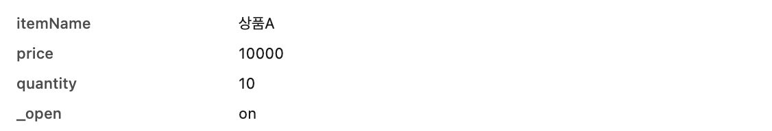 화면의 판매 오픈 체크 박스를 체크 하면 open=on 이라는 값이 넘어간다. html은 true 나 false 같은 불린이 없기 때문에, on으로 값을 내려주면 자동으로 스프링이 true로 해석한다.