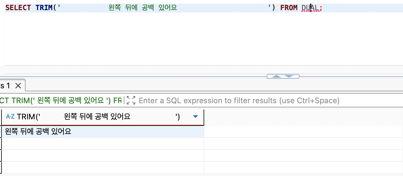 (참고로 왼쪽 공백만 지우고 싶으면 LTRIM() , 오른쪽은 RTRIM() 쓰면 됨)