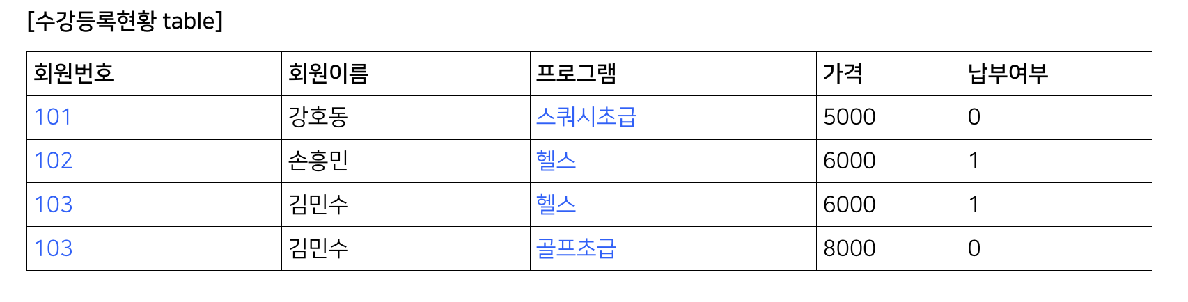 위 테이블을 보면 가격 컬럼은 회원 번호는 프로그램 컬럼에만 종속될 뿐, 회원 번호 컬럼에는 종속되지 않기 때문에 partial dependency가 존재한다고 할 수 있다.