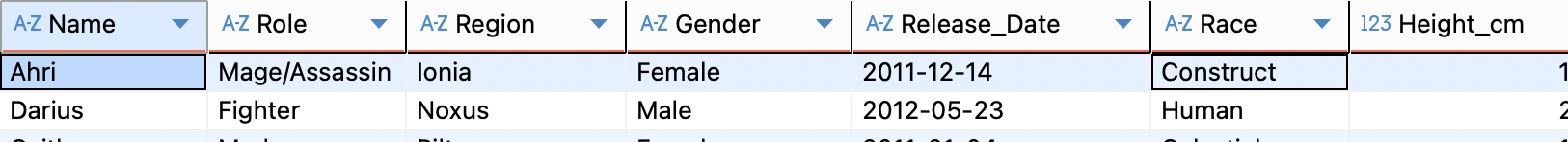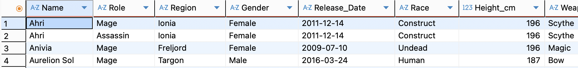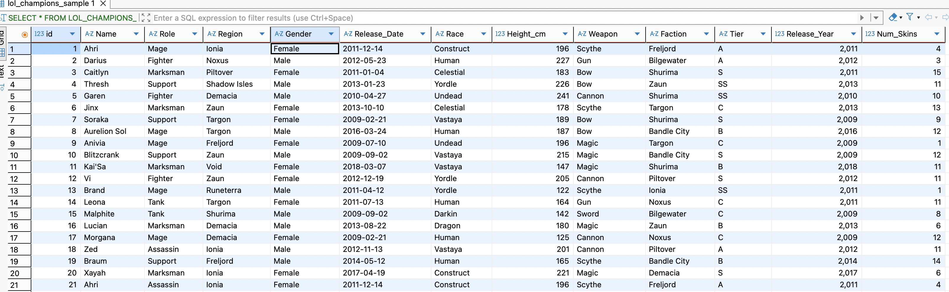 INSERT INTO LOL_CHAMPIONS_SAMPLE VALUES ('Ahri', 'Assassin', 'Ionia', 'Female', '2011-12-14', 'Construct', 196, 'Scythe', 'Freljord', 'A', 2011, 4);