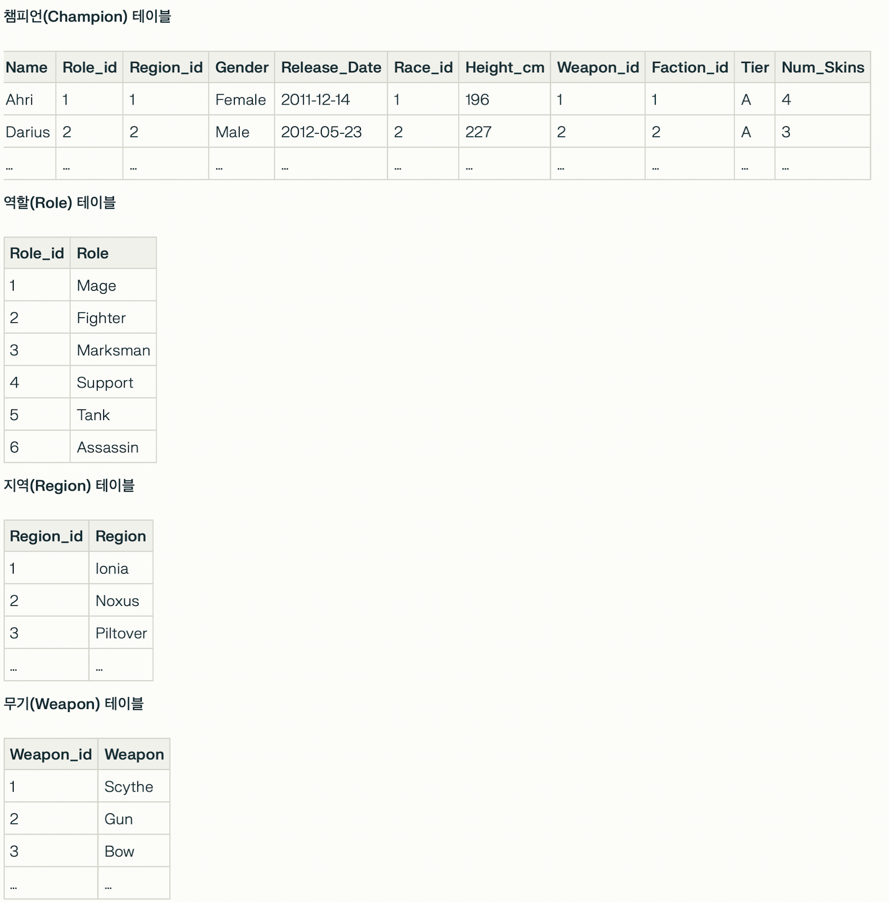 실습을 위해 챔피언 도메인을 기준으로 정규화를 진행해보자.