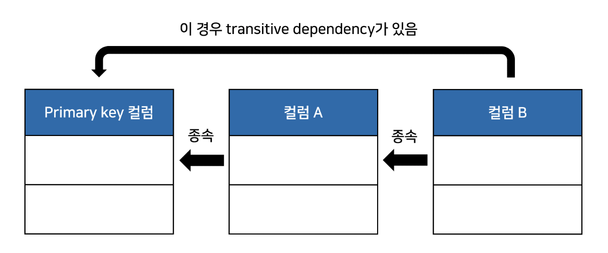 PK에 종속된 컬럼 A가 있고, A에 종속된 컬럼 B가 있을 때, 컬럼 B는 PK에 대해 이행적 함수 종속성이 존재한다고 한다.
