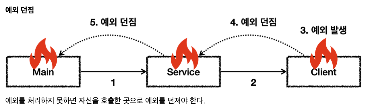 위 예시를 보면, client에서 예외가 터지면, 본인이 잡거나 자신을 호출한 service로 다시 예외를 넘겨야한다.