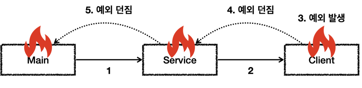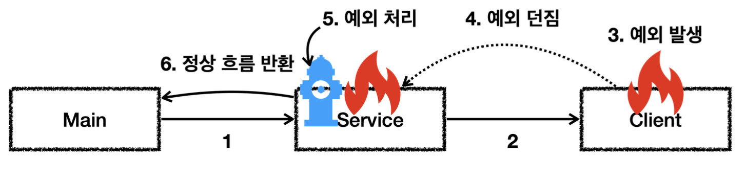 클라이언트에서 발생한 체크 예외를 service에서 잡힌 순서를 그림으로 표현했다.