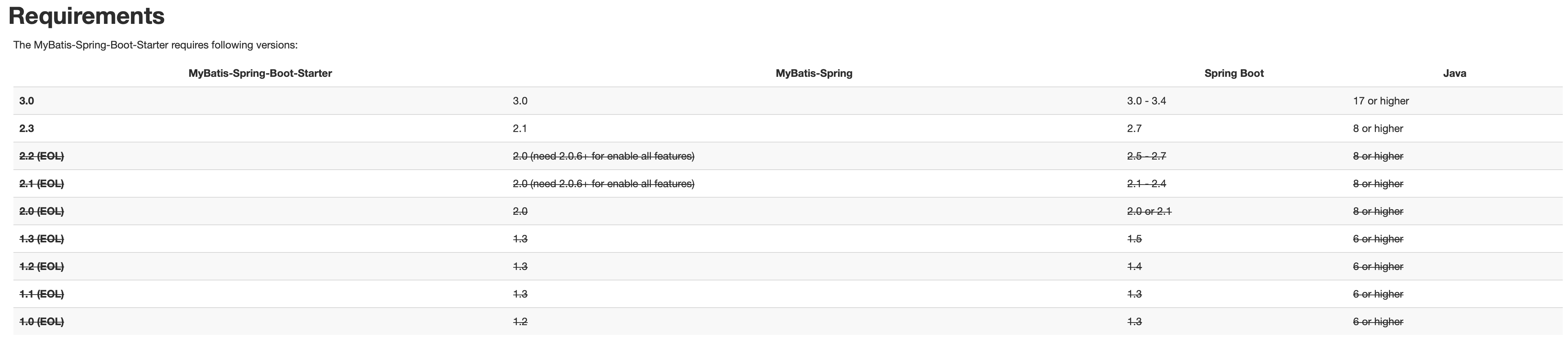 잘 보면, 스프링부트가 3.0 버전 이상이라면 마이 바티스를 3.0 버전을 사용해야하고, 스프링부트가 2.3 버전이면 2.1버전을 사용해라 ~ 라고 친절하게 알려준다.