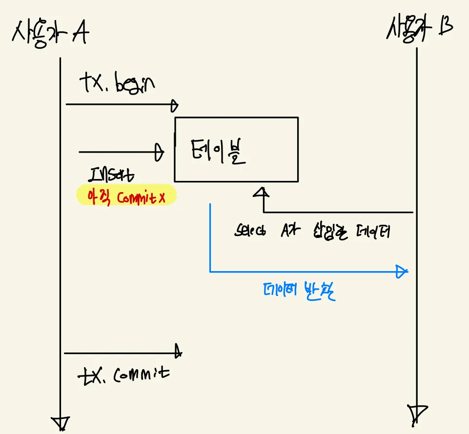 문제는 만약 사용자 A가 저 데이터를 결국 롤백해버렸는데 사용자 B는 그걸 모르고 커밋되지 않은 데이터를 기준으로 작업을 계속 진행할 수도 있다.