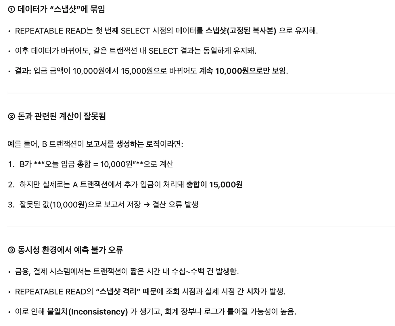 하지만 REPEATABLE READ 격리 수준 트랜잭션에서는 최초 조회 시점에 스냅샷을 따고, 그 스냅샷을 기준으로 트랜잭션 내부에서 같은 SELECT 문에 대해 같은 결과를 반복해서 보여주기 때문에 개발자와 사용자 사이의 데이터 정합성 문제가 발생할 수 있다.