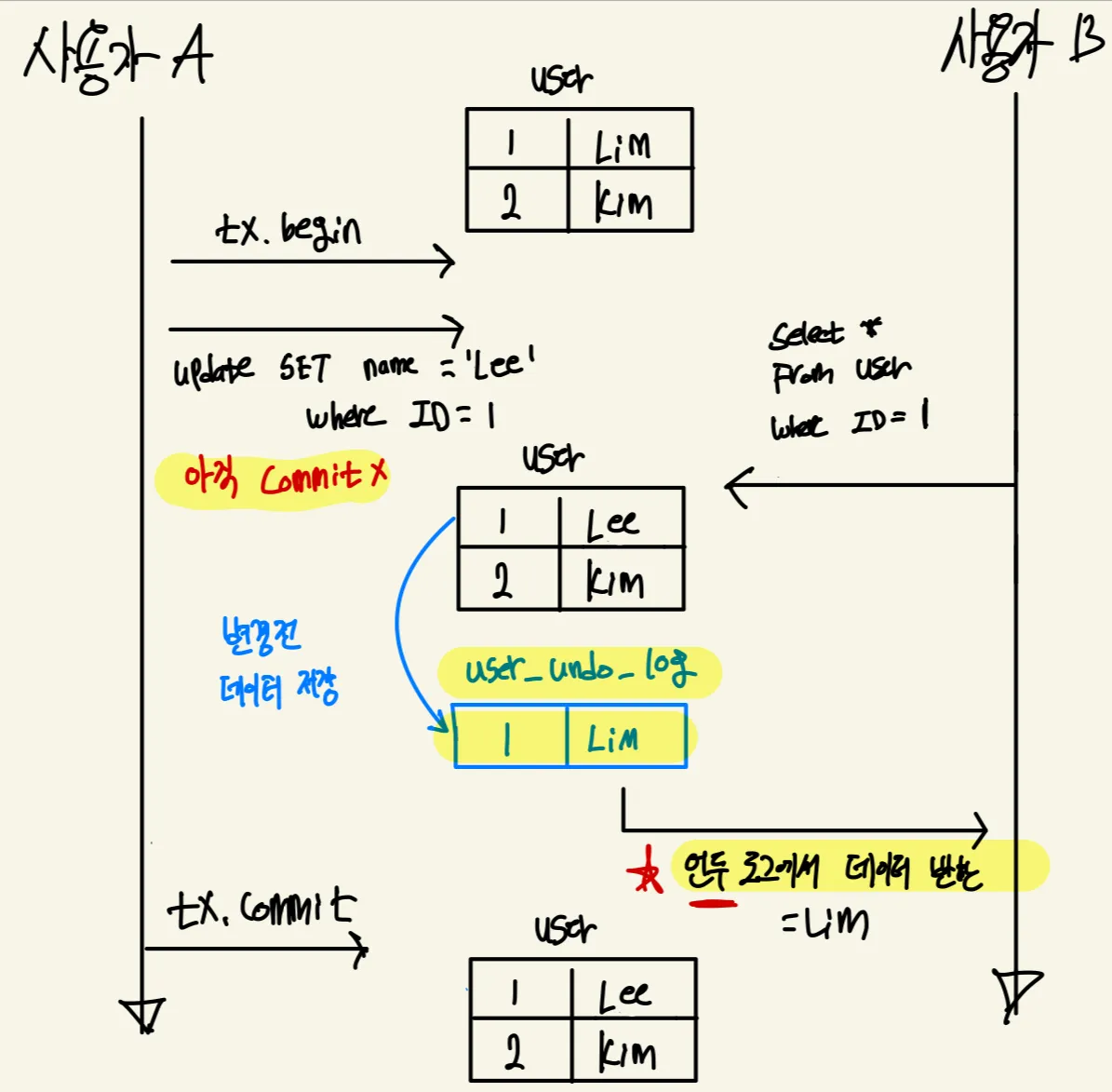 사용자 A가 커밋을 하기 전에 사용자 B가 1번 회원 조회를 시도하면 사용자 B의 쿼리 결과는 실제 테이블이 아닌 백업 영역에서 데이터를 가져오게 된다. 즉 변경 이전 데이터가 보인다.