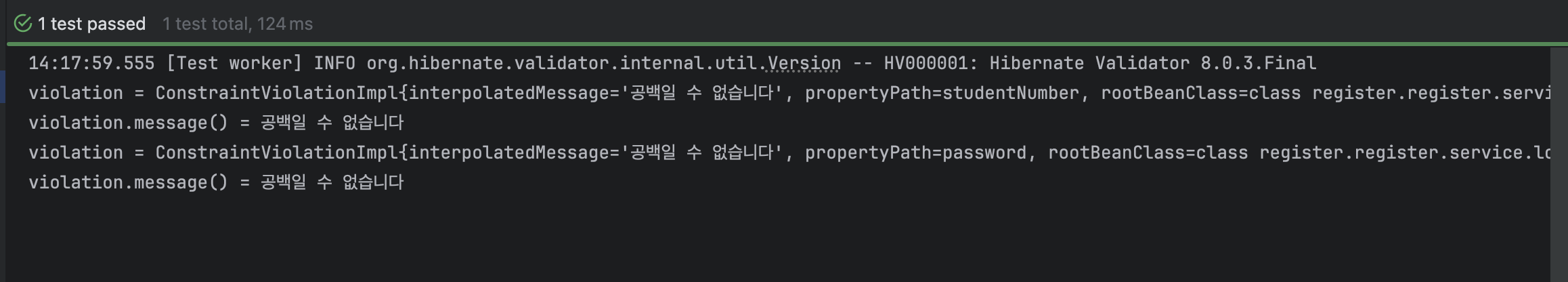 테스트를 작성해보면 form 객체의 모든 필드가 현재 공백임이 검증되었고, 그에 따른 스프링의 기본 오류 메시지가 출력되는 걸 볼 수 있다.