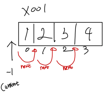 next() 메서드는 다음 요소를 반환하는데, 최초의 인덱스를 0으로 해놔야 다음 항목을 검색할 때, 0번 인덱스를 가르킬 수 있으니 -1로 최초 커서를 설정해두었다.
