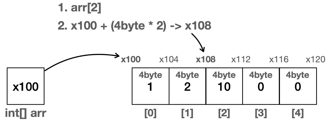 arr[2] 에 대해 공식을 적용해보면, x100+ (4바이트 * 2) 를 계산하면 x108 이라는 인덱스를 찾아 배열에 대한 작업을 취해줄 수 있다.