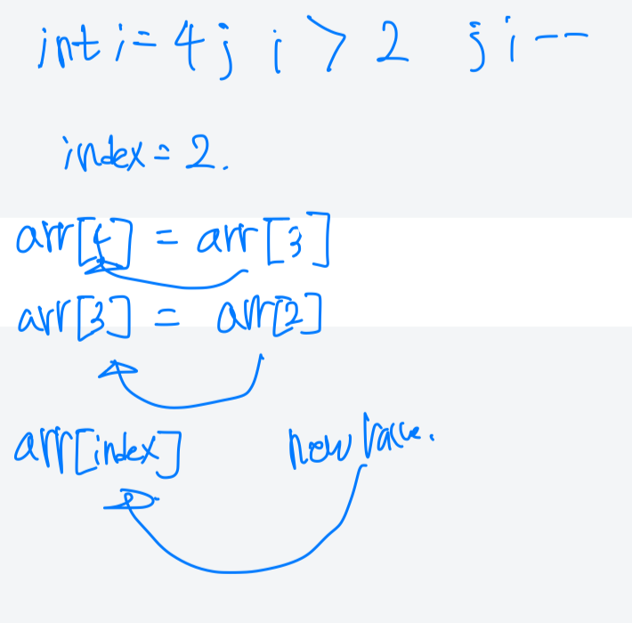 역시나 2번 인덱스부터 한칸씩 뒤로 밀면 된다. 뒤로 미는 작업은 머릿속으로 떠올려보길 바란다!
