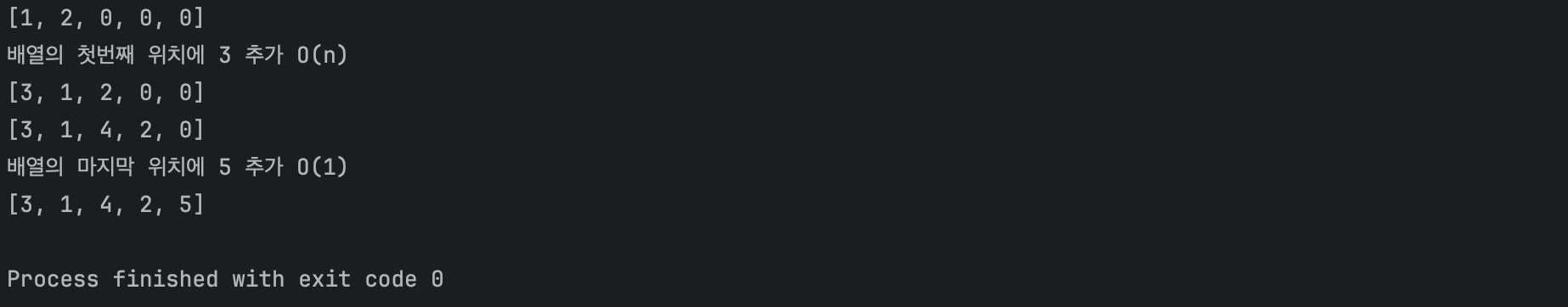 System.out.println("배열의 마지막 위치에 5 추가 O(1)");