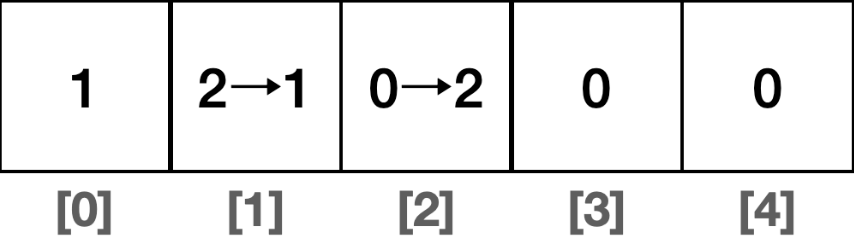 [1 , 1 , 2 , 0 , 0] 이라는 데이터를 가진 배열로 수정되어진다.