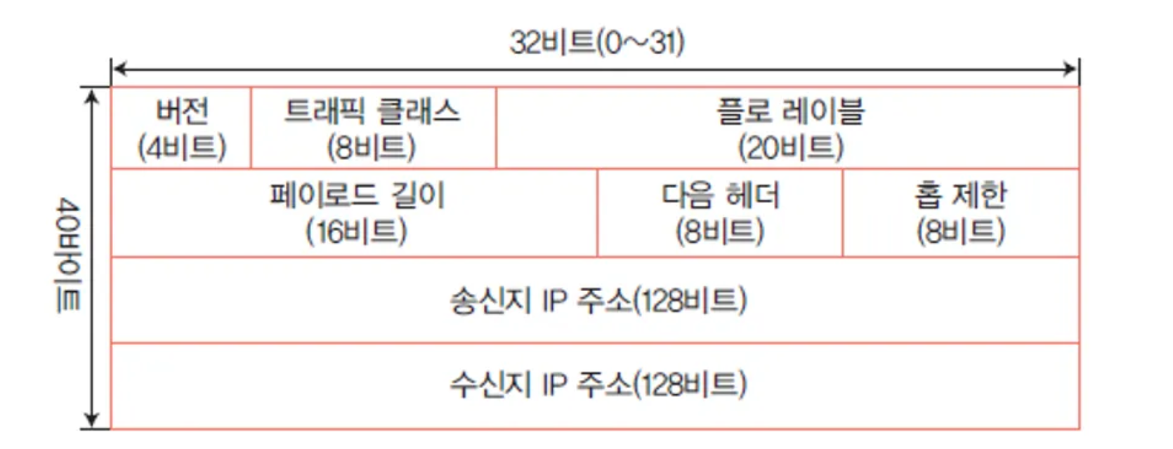 - 트래픽 클래스 : IPv4의 TOS 필드의 명칭만 변경