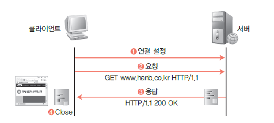 - 클라이언트는 URL을 입력하고, TCP 포트 번호 80을 이용하여 접속하려는 서버에 연결 시도