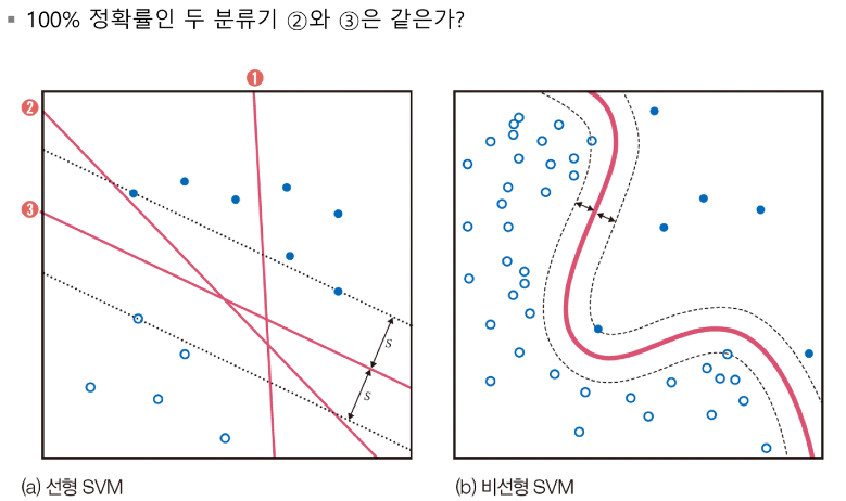 - 과잉 적합을 피해야한다-> 과잉적합이란 아웃라이어를 맞히려고 과다하게 복잡한 결정 경계를 만드는 현상을 과잉 적합이라고 한다. -> 과잉 적합이 발생하면 훈련 집합에 대한 정확률은 높지만, 테스트 집합에 대한 정확률은 떨어지는 일반화 능력 저하 문제 발생